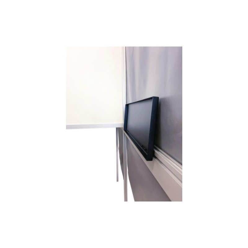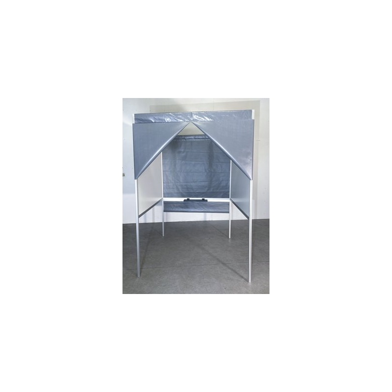 Structure légère en aluminium comprenant 2 panneaux, 4 piètements, 2 traverses, 2 rideaux opaques et 1 tablette fixe et rabattable.