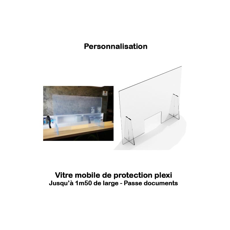 Fabriquée en plexi translucide de 3 à 4mm personnalisable (création de votre choix sur le recto sur 10% de la surface) et équipé d'un espace permettant l'échange avec vos interlocuteurs (30cmx8cm, autres dimensions possibles).