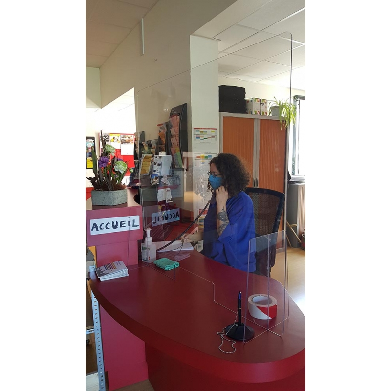 Cet écran de protection est adapté à votre environnement de travaill. Il permet de réduire les risques en faisant barrière aux projections d'air (toux, éternuement, parole...).