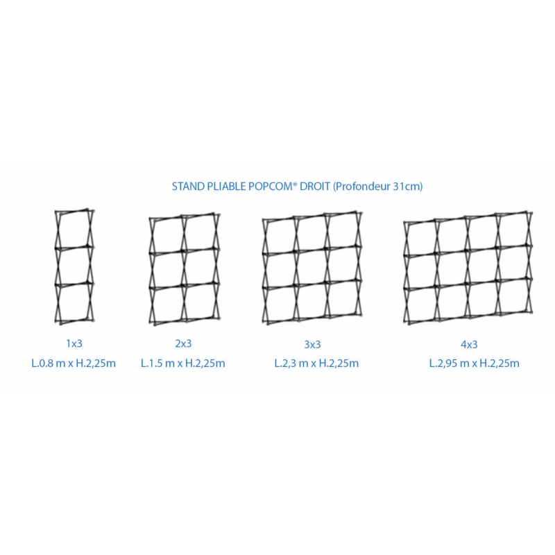 Un large choix de largeurs différentes permettront de répondre à votre besoin. Le stand parapluie ou stand pliable POPCOM® s'adaptera à votre surface. Vous avez le choix entre 5 dimensions. Nous proposons des stand parapluie en 1x3, 2x3,3x3,4x3, 5x3 (le premier chiffre correspond au nombre de "cases" en largeur, le second aux cases du stand en hauteur. Nous disposons d'autres largeurs de stand parapluie plus importantes sur demande. N'hésitez pas à nous contacter pour que nous en parlions.