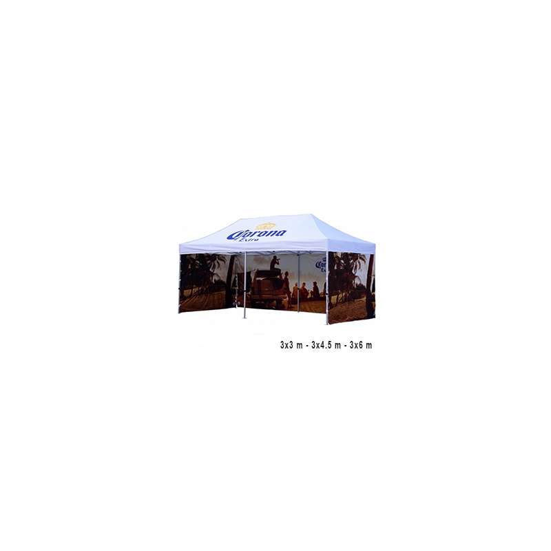 La personnalisation du toit, des côtés, des demi-murs de la tente pliante popup extérieure est réalisée en impression par sublimation en haute définition. Le respect de vos couleurs est garanti.