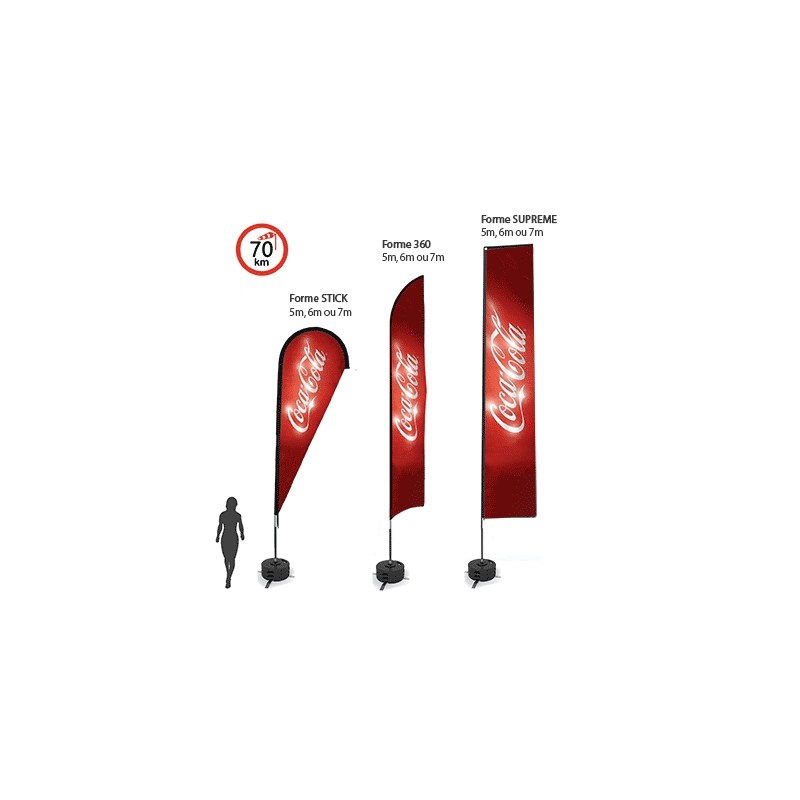 • Résiste à des vents de 70 km/h avec 4 embases béton 10 kg + pied croisillon 4 kg pour le 7m (au moins 3 pour le 6m et au moins 2 pour le 5m)